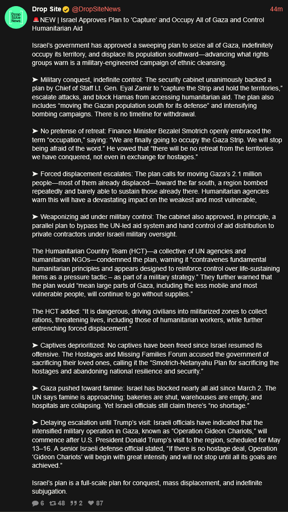 https://xcancel.com/DropSiteNews/status/1919391849837375627#m https://www.aljazeera.com/news/2025/5/5/israel-plans-conquest-of-gaza-in-expanded-offensive https://www.chinadaily.com.cn/a/202505/05/WS68189b89a310a04af22bd855.html https://www.reuters.com/world/middle-east/israeli-cabinet-approves-expansion-gaza-offensive-broadcaster-kan-reports-2025-05-05/