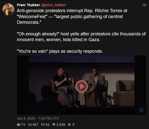 dead [he/him]@hexbear.net to politics@hexbear.netEnglish · edit-26 months agoAnti-genocide protestors interrupt Rep. Ritchie Torres at "WelcomeFest" - "largest public gathering of centrist Democrats"hexbear.netimagemessage-square49linkfedilinkarrow-up1147arrow-down11file-text