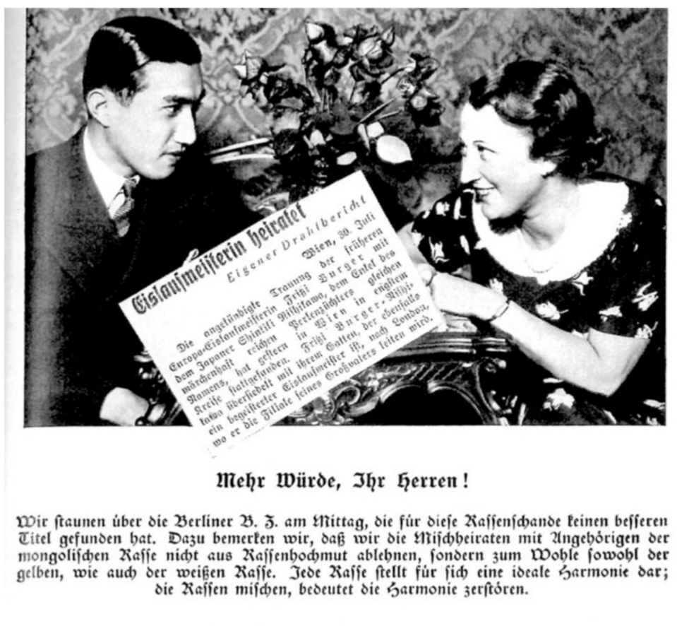 [T]here was no explicit, universal legal restriction on the marriage of a German to a Japanese. As Walter Gross had mentioned in his letter to the DJG, such a marriage was officially highly “unerwünscht” — undesirable. Although this claim came up again and again in [Fascist] papers dealing with race issues, it never became a law.