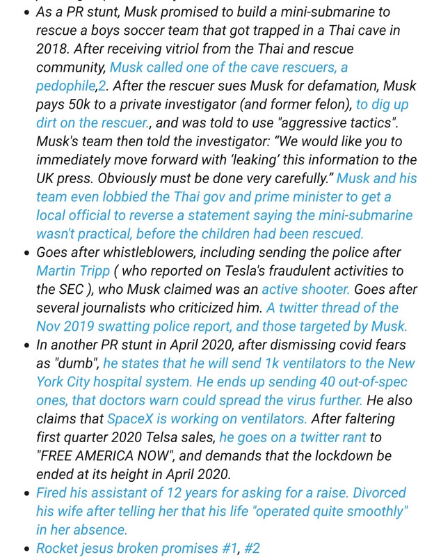 I’ve read some criticisms of E.Musk(, from the funder of Lemmy, who probably temporarily inherited this account while he was a mod for all i know), but back then it was to convince leftists that E.Musk wasn’t an exception : all billionaires are thieves and enemies of the workers. The fact that they had to underline that E.Musk wasn’t an exception may prove something, they/we would have preferred if all these achievements were the results of, e.g., a cooperative, perhaps one day in the future, perhaps in an other country if the west doesn’t destroy it(Huawei).