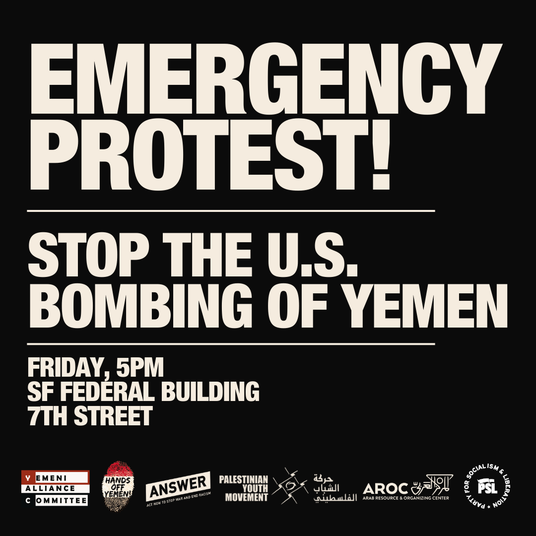 The Biden administration is trying to unleash a regional war with this retaliation against Yemen’s solidarity with Palestine! Anti-war activists are mobilizing at the SF Federal building TONIGHT to protest this major escalation.