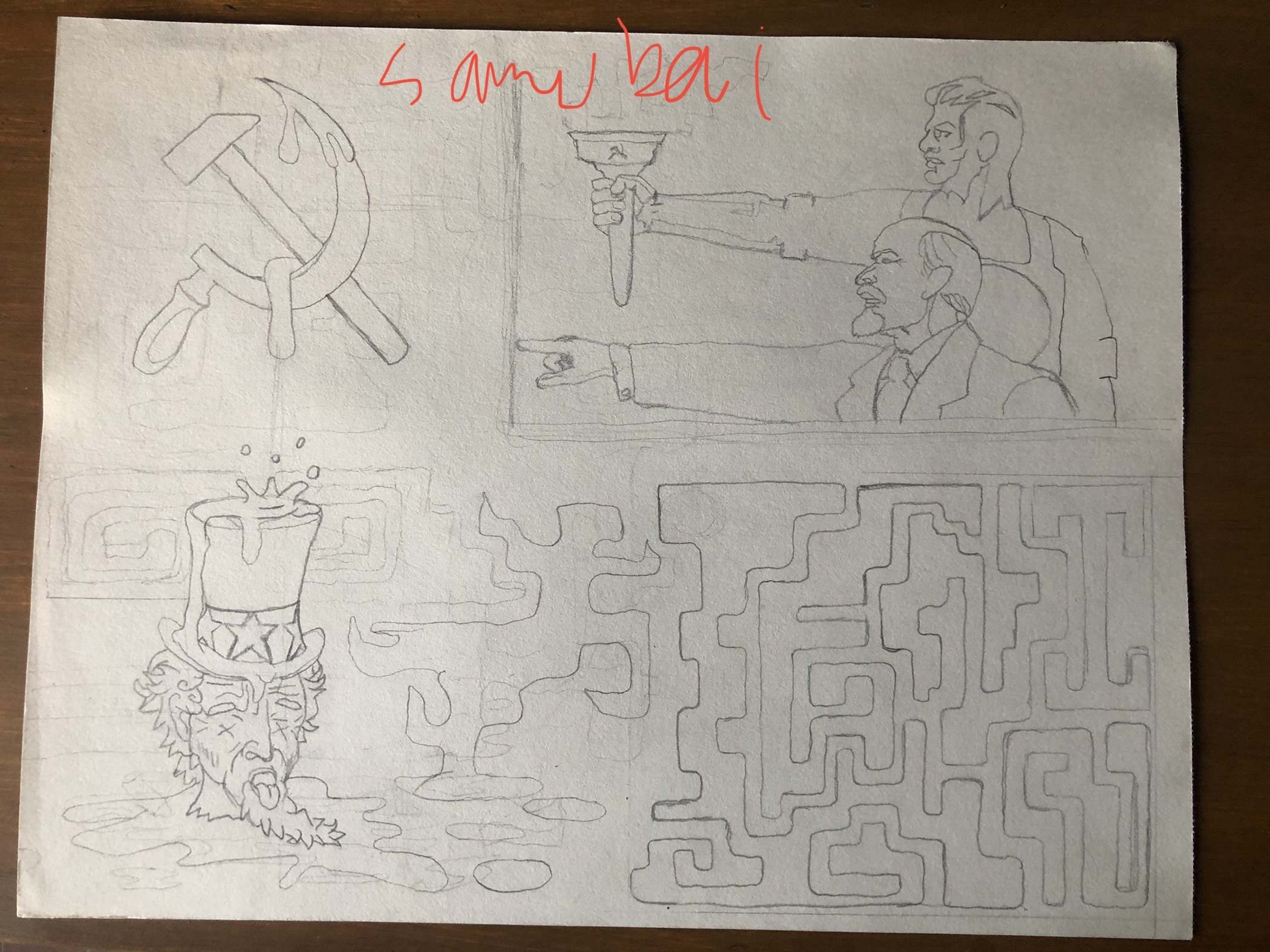 I’m guessing you guys get the symbolism, but the top right corner is Lenin and a worker(I’m thinking of drawing a Starbucks logo on him and making his apron green[because of the strikes]) holding the eternal flame, leading toward a hammer 🔨 and sickle that will be dripping with black oil. Below is the Uncle SAm, the symbol of the US army. He is dead and decapitated. His head bleeds oil. And the bottom right is a graffiti-style font spelling LENIN.