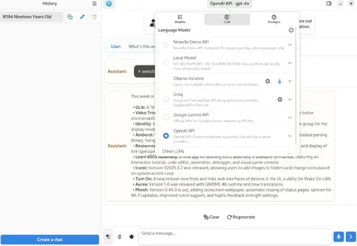 arrow-up153arrow-down1external-linkGNOME AI Virtual Assistant "Newelle" Reaches Version 1.0 Milestonewww.phoronix.comVITecNet@programming.dev to Linux@lemmy.ml · 3 months agomessage-square21linkfedilinkcross-posted to: linux@programming.dev