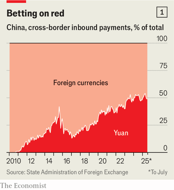 China settles over 50% of its total cross-border receipts (including financial flows) in yuan, up from less than 1% in 2010.