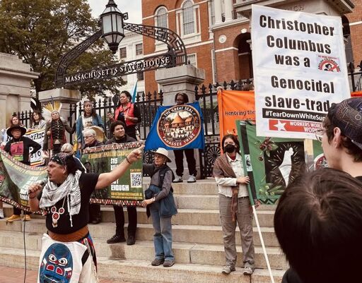 The march ended at Christopher Columbus Waterfront Park, where protesters toppled a statue of Columbus on June 10, 2020. Although the City of Boston never restored the statue, it allowed reactionary Italians to maintain the inscribed pedestal in his honor. Pierite demanded the immediate removal of this monument, which exemplifies the fascism resurgent today.